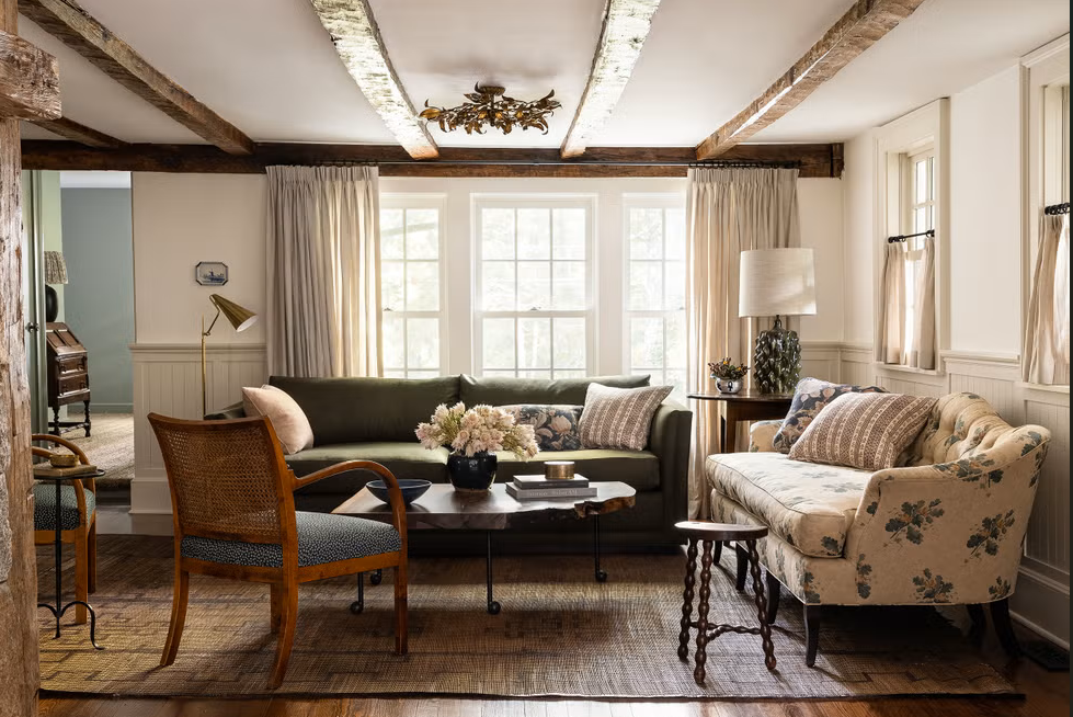 The living room of the house is dominated by custom -made furniture and vintage chairs from BDDW. Particular attention is paid to sofas from Nicky Kejo. One of them is covered with a fabric with an exquisite floral pattern, which gives the room a light and playful atmosphere. Open wooden beams reminiscent of a wooden heritage emphasize the pedigree and add heat and comfort.